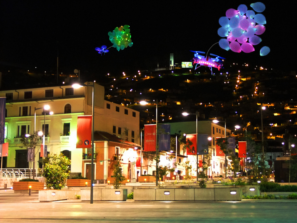 La idea es hacer una puesta en escena artística de la trayectoria trazada por los proyectiles de nuestras tropas. Los obuses serían representados por globos de helio, iluminados con luces LED en su interior (Figura 1), remolcados por drones o avionetas de aeromodelismo para que realicen un recorrido desde el Templo de la Patria hasta la cima del Panecillo. La ruta que han de emprender los globos puede adoptar un desvío para dar una vuelta encima del centro histórico, donde habrá una gran concentración de gente. Esto permitirá acercar el evento al público.