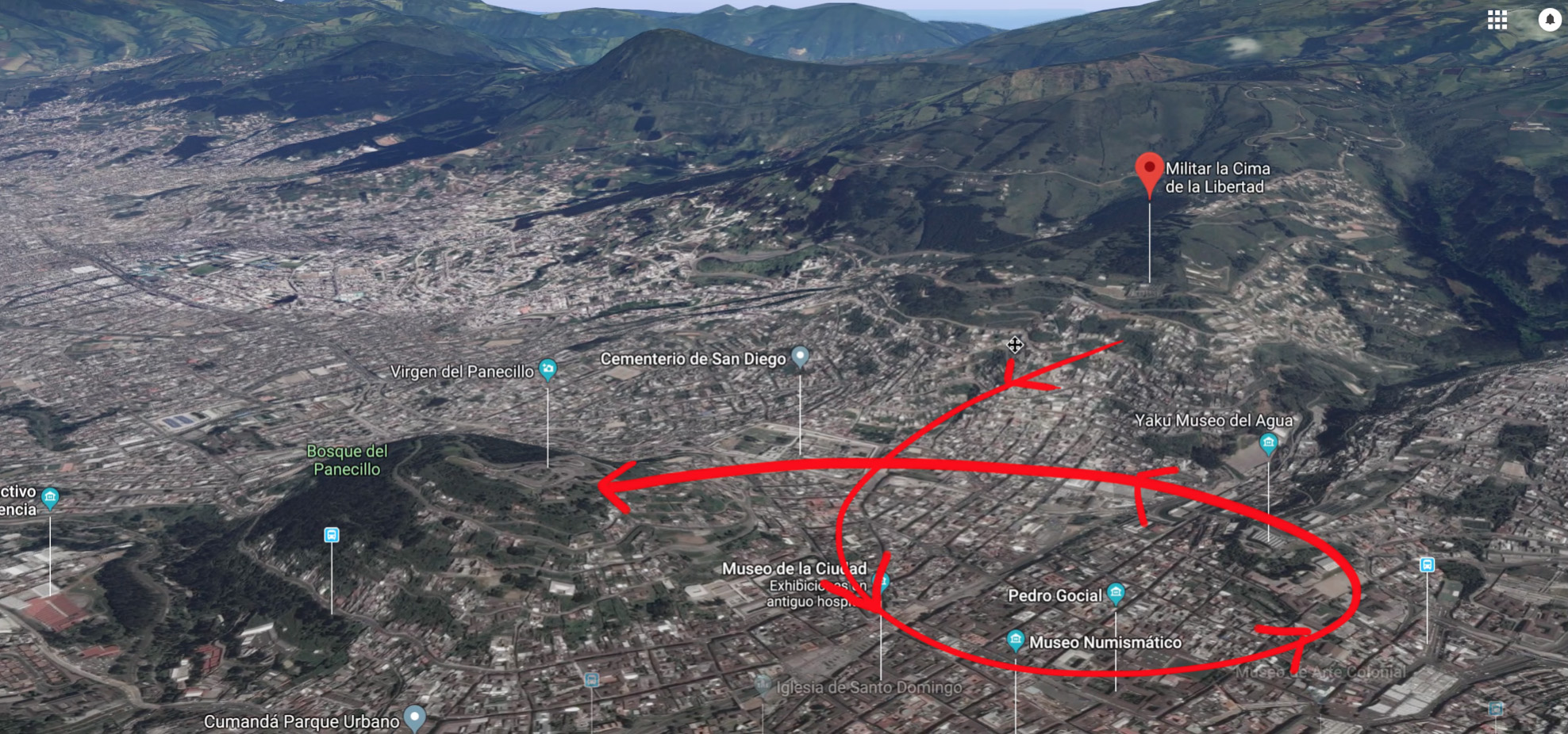 Fig. 2: Vista aérea del espacio en el que tomará lugar esta propuesta: Cima de la Libertad, Panecillo y Centro Histórico.